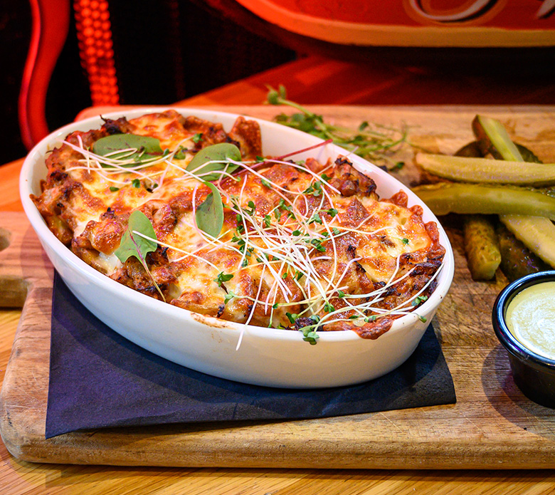 steakhouse fries, pork cracklings, pickled jalapeños, Parmesan, chives, sriracha mayo sauce