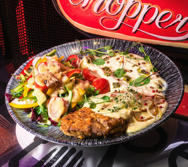 - beer-braised pork knuckle - ribs braised in onions - smokehouse bacon - firepit sausage - grilled chicken with vegetables - roasted chicken wings - fried dumplings - spring salad - bowls of potatoes and fries - 4 sauces