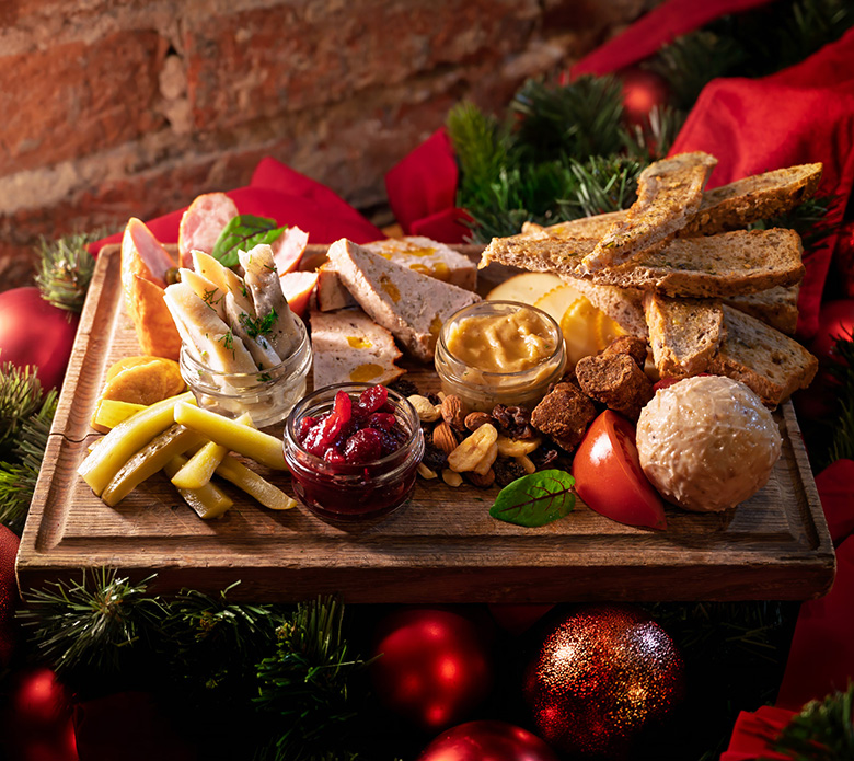 Includes country-style sausage, meatloaf, pâté, pork lard, pickled cucumbers, herb toasts, marinated herring, capers, pickled porcini mushrooms, cranberry, smoked cheese, tomato