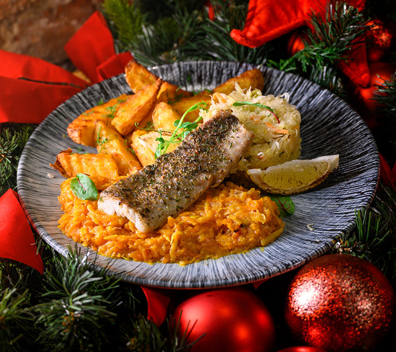 Dry-aged beef, butter-basted with garlic and rosemary. Served with a green peppercorn sauce made with red wine, brandy, onion, and thyme. Accompanied by steak-cut fries and caramelized carrots with tarragon.